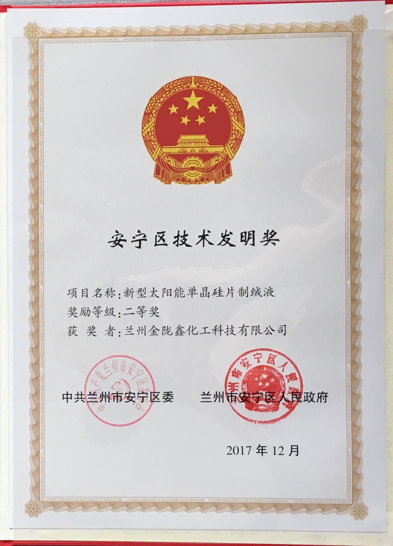 恭喜我公司項(xiàng)目《新型太陽能單晶硅片制絨液》獲得安寧區(qū)科技發(fā)明獎(jiǎng)二等獎(jiǎng),同時(shí)感謝技術(shù)部全體人員為公司的發(fā)展所做出的巨大貢獻(xiàn)。希望你們?cè)俳釉賲杽?chuàng)造更大的輝煌!